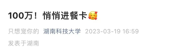 其实,这样“悄悄暖心”的高校并不少见。今年3月,湖南科技大学宣布将100万元餐费悄悄打进部分学生的卡里。学校根据食堂消费大数据,对在食堂消费次数多、每餐平均消费额度低的学生发放餐补,发餐费无需学生申请。学校确认人选后,不公布名单,直接悄悄打进卡里。