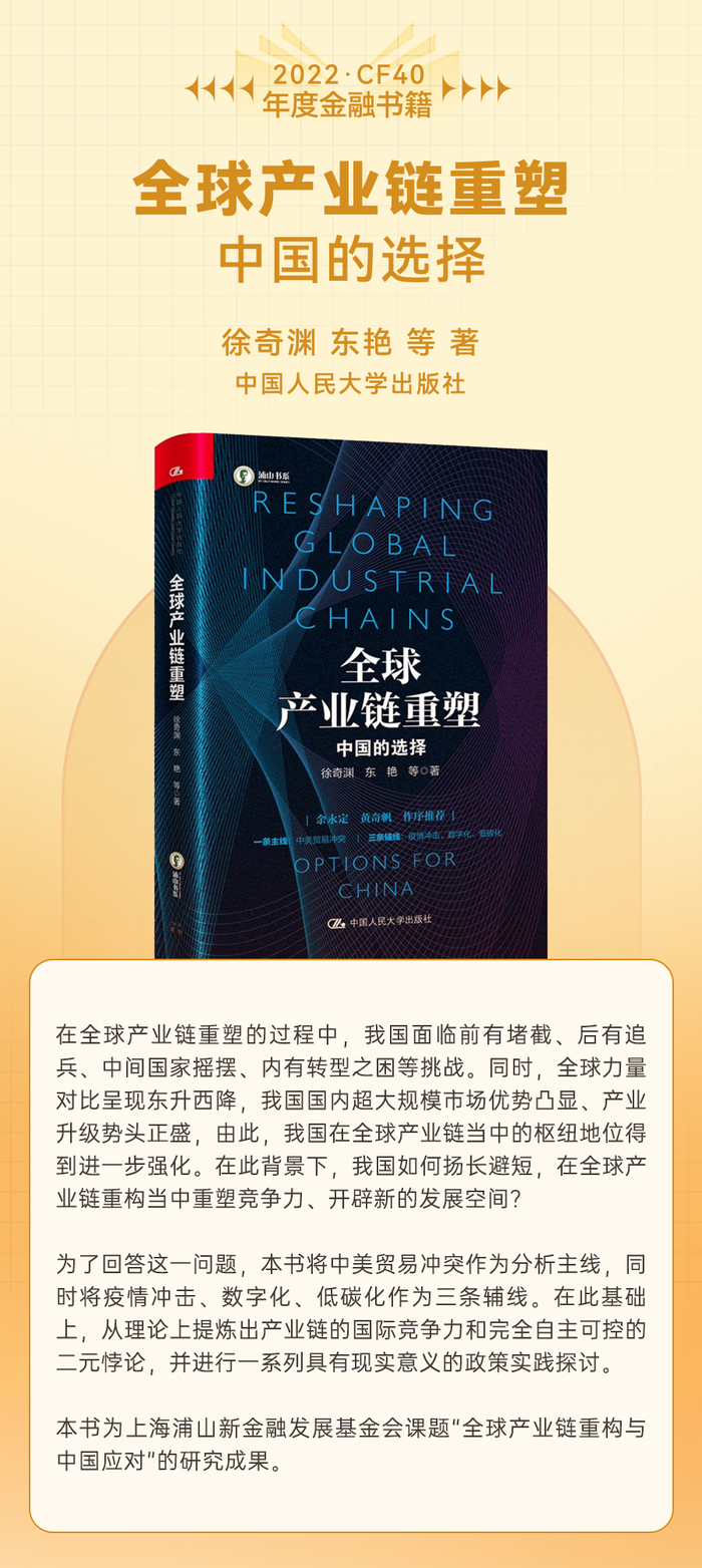 其中,黄益平、王勋专著《读懂中国金融——金融改革的经济学分析》,刘尚希专著《共同富裕与人的发展:中国的逻辑与选择》,徐奇渊、东艳牵头的专著《全球产业链重塑——中国的选择》等多部著作获得业界高度评价。