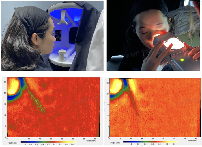 *绿色荧光处为左脸颊纹路深浅前后对比