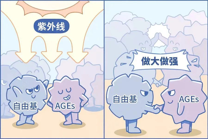 最烦人的是,这俩破坏分子还会相互「勾结」互相促进生成,进而对胶原蛋白造成恶性循环的破坏[3]。