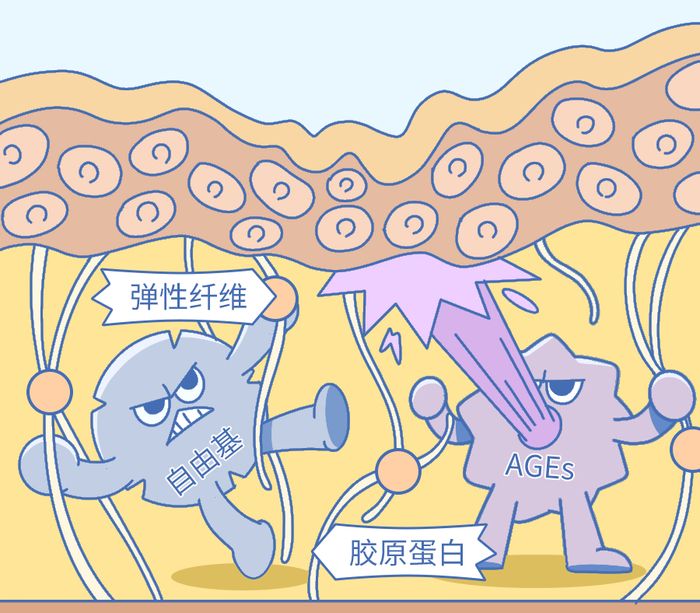 紫外线搞破坏的第二棒子是皮肤的糖化反应:糖类和真皮中的胶原蛋白发生反应后,最终会形成一种不可逆的高级糖基化终末产物(AGEs)。