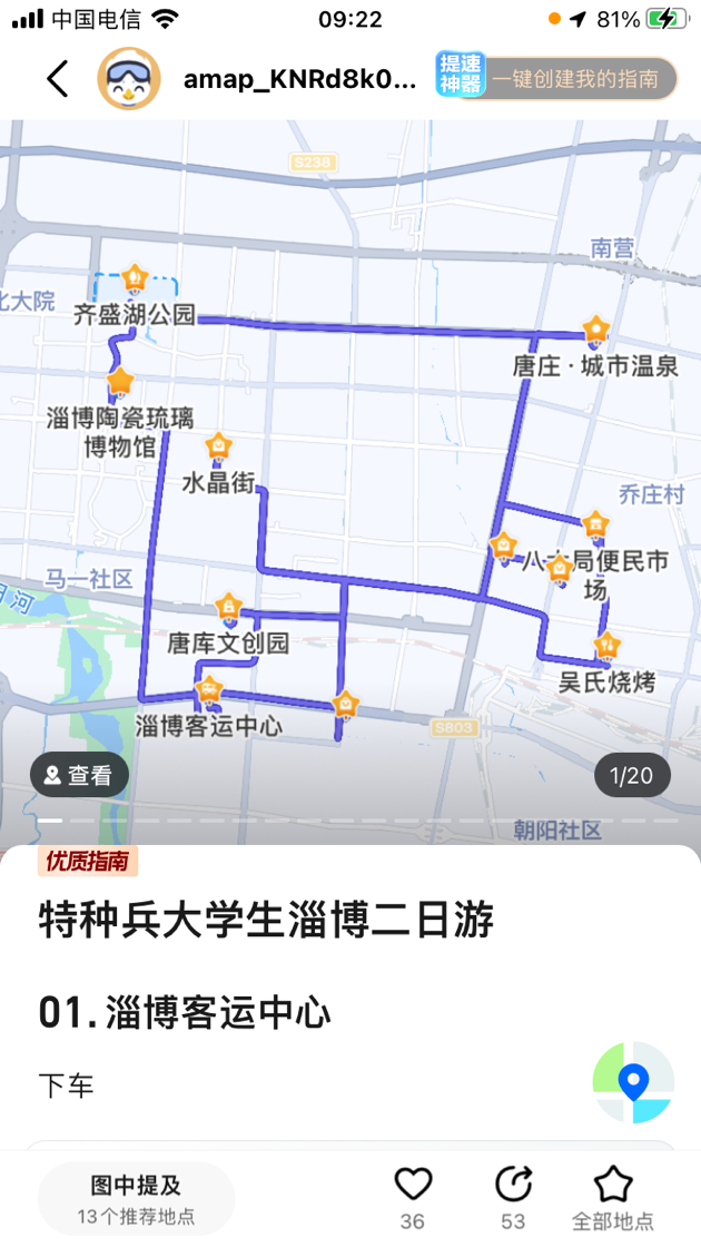 吃烧烤之余,许多人自然也会想到领略一番淄博城市的其他特色,而这种需求也是高德“淄博烧烤导航”研发时的考虑范畴。本次淄博烧烤导航专页,整合了高德指南中针对淄博市的优质特色游览路线,方便喜好游览城市的用户参考,例如“特种兵大学生淄博二日游”路线,即是从学生视角出发,包含吃喝玩乐一条龙的高密度、全方位淄博探索攻略。