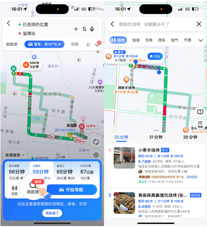 例如针对自主驾车出行的用户,在高德地图中设置好起点和终点之后,点击“顺路搜”中的“烧烤”,即可查看沿途路线的烧烤店铺基本情况,包括用户评分、人均价格、具体地址、营业时间及优惠信息等;而结合高德实时交通算法,更可以根据交通路况,动态计算各个店铺的驾车时长,以便用户更好地综合决策,一键添加心仪店铺作为途径目的地,导航前往。
