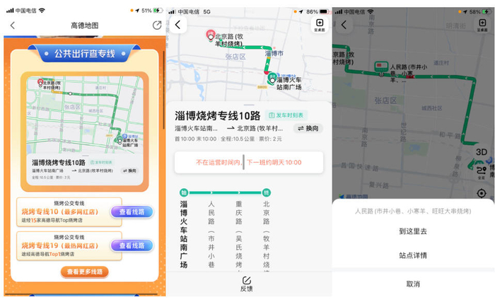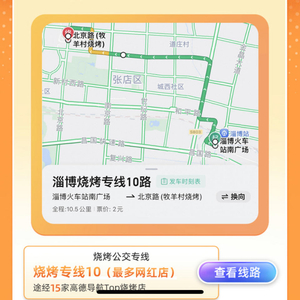 而对于选择公共出行的烧烤爱好者而言,没有什么是比一条扎入烧烤店铺海洋的路线更实用的了。为此,淄博市公共交通有限公司特意新增了21条“淄博烧烤”定制专线,从火车站出来,直接坐公交就能去烧烤店。而高德“淄博烧烤导航”也已全盘收录这21条烧烤公交专线,用户可一键点击查看具体路线和相应途径的烧烤店铺,并可在地图上选择心仪站点,导航前往。