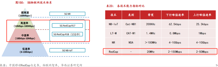 在5G物联网体系中,5G NR能力最高,可满足100Mbps以上超高速率需求的物联网业务,5G NB-IoT面向低速率、小包物联网业务,承载100kbps速率以下低速物联网业务。RedCap补齐了5G中高速大连接能力,使5G面向各类物联网应用需求形成了低、中、高以及超高速率的完备技术承载体系。