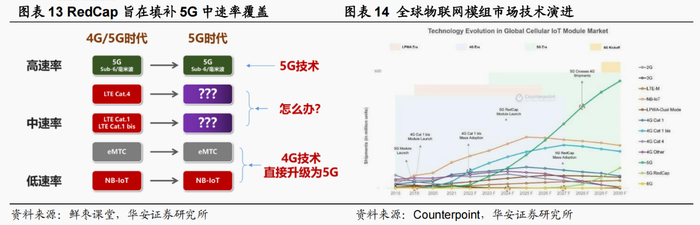国信证券马成龙在1月15日的研报中表示,RedCap是后续中速率物联网模组迭代的方向,将对Cat.4/Cat.1形成替代。目前中速率的应用场景主要依赖LTE Cat.4和LTE Cat.1,5G并没有实现完全覆盖。4G退出历史舞台后,5G发展必然补齐空缺。Rel-17定义的RedCap最大带宽为20MHz,旨在替代LTE Cat.4。预计2023年冻结的Rel-18将再定义一个版本,届时RedCap最大带宽为5MHz,旨在替代LTE Cat.1。