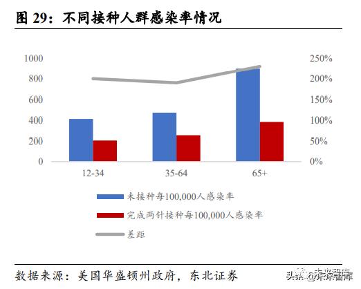 疫苗的有效性在英美疫情中得到了印证。接种且完全接种疫苗的人群在新冠病毒面 前的抵抗力远远大于未完全接种和未接种人群,且疫苗的有效性数据在各个年龄段 都有非常明显的体现。根据美国华盛顿州于 2022 年 12 月出示的报告显示,在奥米 克戎流行的 2022 年,未接种疫苗的 12-34 周岁人群新冠病毒的住院率相较接种完成 两针疫苗的人群高 4.7 倍。未接种疫苗的 35-64 周岁人群住院率相较接种完两针疫 苗人群高出 3.3 倍;对于未接种疫苗的 65 周岁以上的老年人,其住院率相较完成两 针接种者高出 3.2 倍。此外,此报告还反映出疫苗在减少传染率和死亡率方面的效 果。由此可见,疫苗强有力得削弱病毒毒性,减少重症及死亡率。