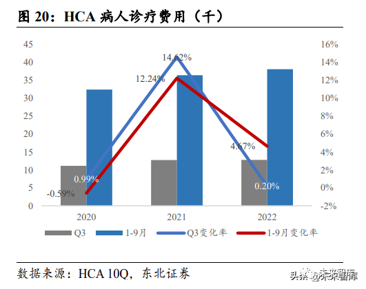 从美国的经验来看,疫情因新增感染病例增加,医疗成本会有大幅提升。美国 HCA 和 UnitedHealth(联合健康集团)财报披露的数据反映出在 2021 年两家医疗公司的 医疗服务成本相比 2020 年有较大增长。相比于 2019-2020 年前三季度疫情爆发初期 均小于 1%的医疗服务成本变化率,2020-2021 年两家公司的医疗服务成本均有大幅 增加。其中 HCA 2021 年前三季度相比 2020 年增长 12.24%,联合健康集团 2021 年 前三季度相比 2020 年增长 18.27%。排除美国在疫情期间通货膨胀严重的因素(2021 年 9 月 CPI 为 5.4%,2022 年 3 月 CPI 为 8.5%)来看,2021 年和 2022 年病人护理 成本增幅仍然处于较高位置。