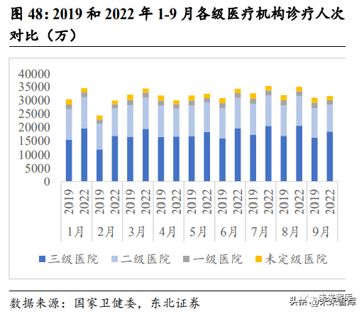 对比 2019 年和 2022 年的医院诊疗人次和出院人次反映出三年疫情极大阻碍了中国 医疗服务的正常运营秩序,在出院人次和诊疗人次方面影响巨大。医院运营效益会 随着疫情封控政策紧缩而迅速走低,一旦疫情封控政策放缓,运营会恢复正常。比 较疫情前 2019 年和 2022 年的诊疗人次数据可以发现,2022 年前三季度的封控主要 因上海疫情集中于 4 月。因此,相比于 2019 年,2022 年 4 月的诊疗人次与出院人 次都大幅下降。在其他疫情封控政策相对较松的其他月份,2022 年相比于 2019 年 都有小幅度增长。