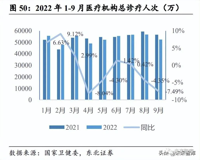 2022 年 1-9 月,全国医疗卫生机构总诊疗人次 48.2 亿(不包含诊所、医务室、村卫 生室数据),同比下降 0.7%。医院 29.8 亿人次,同比下降 2.6%,其中:公立医院 25.0 亿人次,同比下降 3.6%;民营医院 4.8 亿人次,同比增长 3.1%。就服务诊疗人次和 入院人次而言,2022 年 1-3 月诊疗人次与出院人次同比均处于增长状态,尤其是医 院的增长。2022 年 3 月底,受全国大范围散发性疫情的影响, 4 月全国整体诊疗人 次与出院人次迅速下滑,5 月下滑幅度有所收缩,6 至 7 月开始上升。2022 年 8-9 月,诊疗人次再次下滑,10 月预计持续下滑;出院人次处于同比增长状态,10 月预 期持续增长。