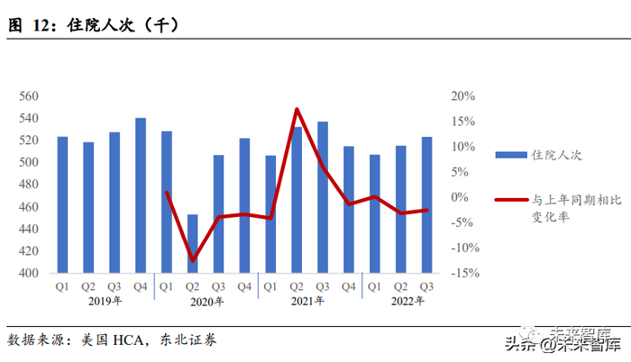 HCA 财务报告中所记录的急诊室接待人次也反映了疫情封控对正常医疗秩序的影 响。2020 年 2 月,疫情封控开始后,急诊室接待人次同比 2019 年同期下降 32.72%。虽然在第三和第四季度相比第二季度有小幅度回升,却仍旧处在历史低位。2021 年 第三季度,随着美国疫情防控政策逐渐放开,急诊室接待量达到疫情后高峰。在 2022 年年初因为美国防疫管控而经历短时间下降后,在 2022 年第二与第三季度随着疫 情管控政策取消而回升。尽管 2022 年第二与第三季度数据仍旧略低于疫情前数据, 却已经呈现稳步上升趋势。