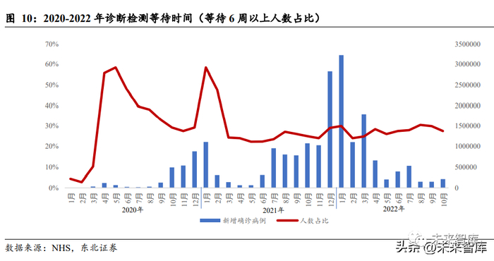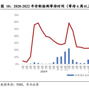 英国 NHS 公示的数据显示出疫情封控期间,医疗系统运作效率相比疫情前有明显 下降;并且,医疗系统运作效率与新增感染人数有着密切联系。2020 年第二季度至 第三季度末,因新冠病毒封控政策影响,英国英格兰诊疗检测等待时间 6 周以上人 数占比从 2 月的 2.77%升至最高 5 月的 58.45%,增长 201%。虽然在 2020 年第四季 度有所缓和,等待 6 周以上人数占比维持在 30%以下;但是由于 2020-2021 跨年期 间新冠病毒感染人数上升导致在 2021 年年初等待 6 周以上人数占比升至 58.45%。自 2021 年第一季度开始,等待时间基本维持在疫情期间的较低水平。在国内解除动态清零政策后,医疗系统运作效率会在短期内会因为感染人数达到顶 峰,加上国内人口众多的国情,病患等待时长会迅速上升。在第一轮感染高峰过后, 医疗系统运行效率会逐渐恢复,接着缓慢回归到疫情前水平。