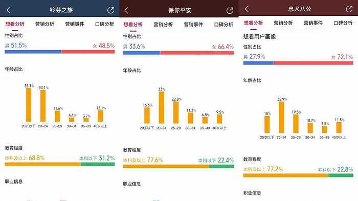 近期上映的电影里,24岁以下观影“想看”人群达到50%以上的电影,只有《铃芽之旅》《忠犬八公》和《保你平安》。尤其是《铃芽之旅》,它的比例高达68%,18岁以下比例更是高达35%,证明该片的高票房并非来自新海诚老粉,而是出自更年轻的新观影群体。