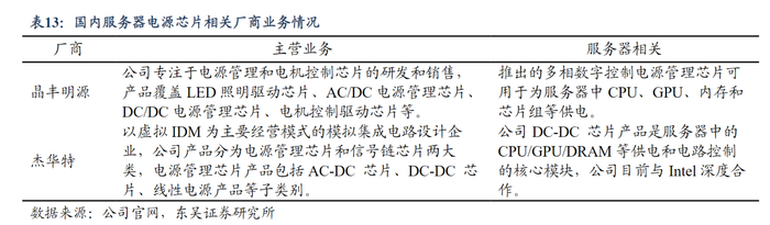 据东吴证券分析师张良卫等4月3日发布的研报梳理,国内服务器电源芯片厂商方面,晶丰明源推出的多相数字控制电源管理芯片可用于为服务器中CPU、GPU、内存和芯片组等供电;杰华特DC-DC芯片产品是服务器中的CPU/GPU/DRAM等供电和电路控制的核心模块,公司目前与Intel深度合作。