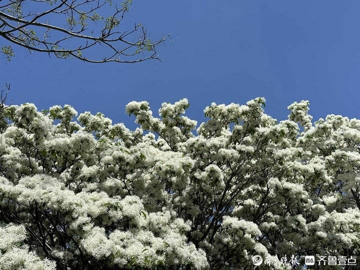 千佛山流苏正在盛开,如覆霜盖雪,花香浓郁。因为盛开时花朵挂满枝头,犹如古代仕女服饰的流苏而得名。