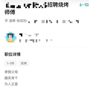 一家张店区烧烤店发布的招聘信息显示,该店要招聘烧烤师傅需要每天上午10时上班,但下午可以休息,直到16时30分再上班到晚上23时。该烧烤店介绍,应聘者年龄在18至45岁,有两年以上熟练的烧烤经验。此外该烧烤店还同时招聘餐饮学徒,主要负责协助烧烤师傅完成后厨工作,烧烤店称学徒一个月后可以学成,从而获得加薪,要求学徒聪明好学、踏实肯干。