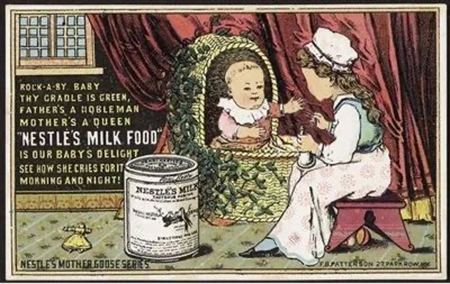 十九世纪下半叶的婴儿奶粉广告,印制于雀巢公司发放给客户的交易卡上。实物现藏于波士顿公共图书馆。