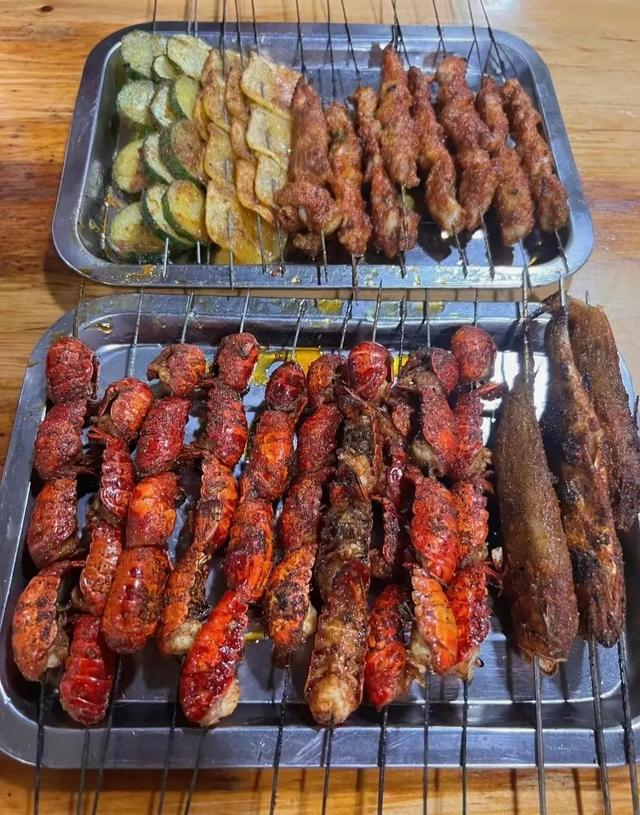 除烤虾之外,还有肉串、肉筋、凤爪、土豆、韭菜……菜单品类齐全,烤上满满一桌,荤素搭配,再叫亲朋好友一同坐下畅聊,岂不美哉?