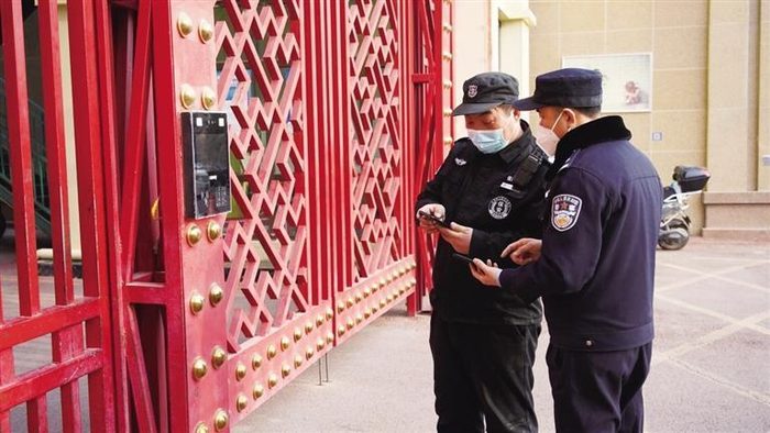 城关分局九州派出所民警与小区安保人员沟通智慧门禁