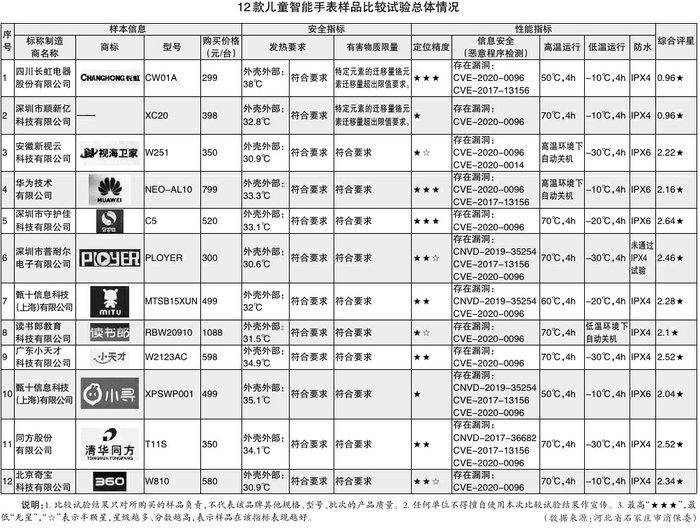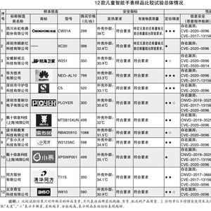 近年来,集手表、通话、定位等多种功能于一体的儿童智能手表深受欢迎。近日,河北省石家庄市消保委发布了12款儿童智能手表样品比较试验分析报告,结果显示,12款样品在应用程序自身防护机制方面均存在不同程度高危漏洞;长虹等2款样品有害物质限量超出标准限值要求;华为等2款样品高温运行表现不佳,读书郎样品低温运行表现不佳;普耐尔(PLOYER)样品未通过IPX4试验(箱式淋雨试验),防水性能表现不佳。