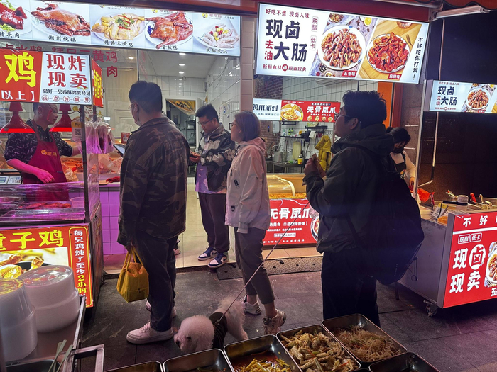 “夜市小吃品种多,可以挑挑选选。”下班后刚从泗泾地铁站走出来的蒋立与女朋友汇合,准备趁着夜市人不多,“遛狗”的同时逛一圈夜市,“家里有米饭,正好买点熟食回去当晚饭。”