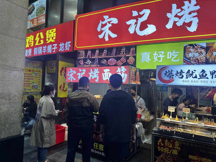 在泗泾三湘商业广场经营牛肉面近十年的韦振风有发言权。去年11月,在政府部门支持外摆经营,活跃“夜经济”的背景下,泗泾三湘商业广场商户自发形成夜市。“当时,受疫情影响,大家生意都不好,广场二楼空置率极高。”韦振风说,最艰难的时候,大家不约而同尝试摆摊引流。因为商业广场内街长约300米,宽达到近6米,有做夜市的基础。