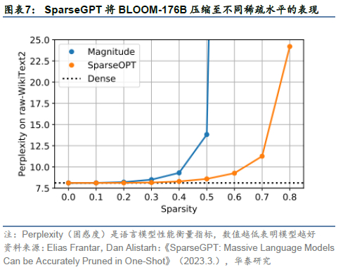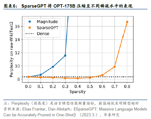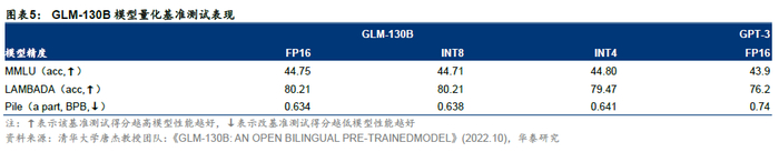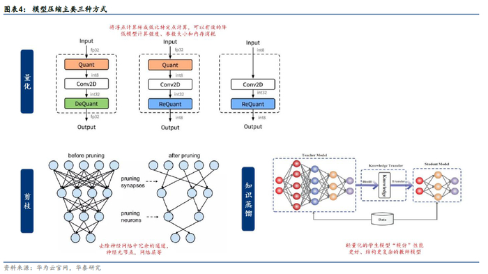 模型压缩技术可在保有大模型原有性能和精度基本不变前提下降低对推理算力的需求:1)量化:将浮点计算转成低比特定点计算 2)网络剪枝:去除神经网络中冗余的通道 、神经元节点等;3)知识蒸馏:将大模型作为教师模型,用其输出训练性能接近、结构更简的学生模型。以清华大学唐杰教授团队2022年8月发布的1300亿参数模型 GLM-130B 为例,原模型支持在一台 A100 40G*8)或 V100 32G*8 )服务器上进行推理,而将模型量化至 INT 4精度后,相较INT 8精度其所需 GPU 内存降低50%,且可在一台4×RTX 3090(24G)或 8×RTX 2080Ti (11G )服务器上进行推理。