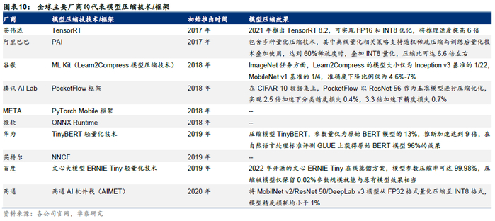 上世纪学术界率先提出网络剪枝技术,并一直引领模型压缩技术的突破。业界的发展紧随其后,并进一步将模型压缩技术集成至移动端模型部署框架/工具,主要部署的模型包括:1)深度学习框架厂商:谷歌(ML Kit)、Meta(PyTorch Mobile);2)硬件厂商:英伟达(TensorRT)、英特尔(NNCF)、高通(AIMET)等;以及3)云服务厂商:微软(ONNX Runtime)等。以谷歌2018年推出的ML Kit为例,核心功能Learn2Compress模型压缩技术结合网络剪枝、量化以及知识蒸馏三项技术,可实现在CIFAR-10图像分类测试任务中生成较NASNet尺寸缩小94倍的轻量化模型,且仍保持90%以上精度。