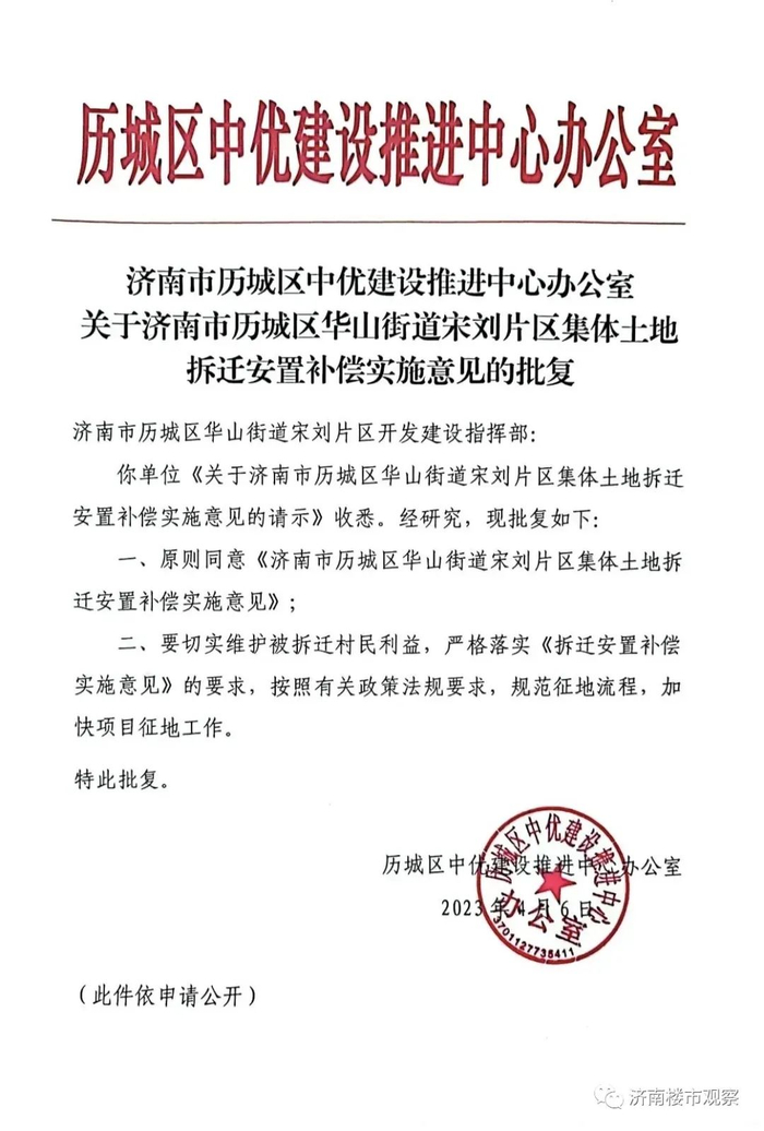 而且,历城区中优建设推进中心办公室已经发布文件,批复同意宋刘片区集体土地拆迁安置补偿实施意见。