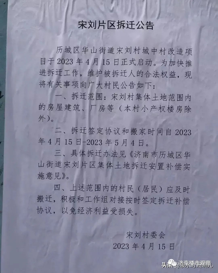 4月15日,宋刘村正式发布拆迁公告。其中明确,宋刘村改造项目于4月15日正式启动,宋刘集体土地范围内的房屋、厂房(小产权楼房除外)将拆迁。拆迁协议签订和搬家时间是4月15日-5月4日。