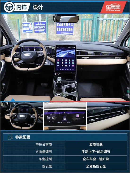 吉利博越L双拼配色内饰非常前卫,尤其是钢琴烤漆饰板内融合了竖向排列的氛围灯,可跟随音乐、空调呈现出律动效果。在材质上,车辆内部采用了大量皮质面料包裹,并且在中控台顶部还采用了翻毛皮材质,提升了档次感。全新的四辐式方向盘同样采用了双拼配色,扁平化设计也有了些许运动气息。全液晶仪表显示清晰,可提供多媒体、驾驶辅助等多种信息。