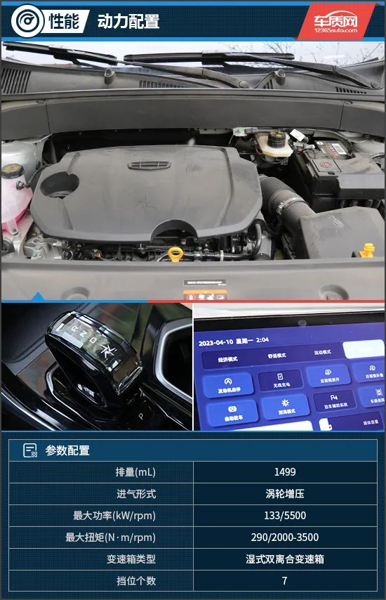 动力上,本次试驾的吉利博越L搭载了1.5T涡轮增压发动机,发动机最大功率133kW,最大扭矩290N·m。传动方面,与发动机匹配的是7挡湿式双离合变速箱。