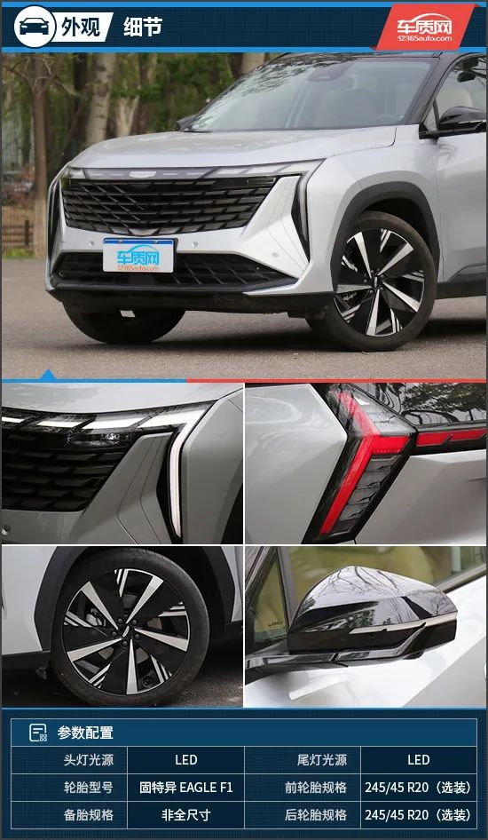 在细节上,贯穿前脸的LED灯带在两端向下延伸,且与保险杠两侧的导气口融为一体,而前大灯则与前格栅融为一体。贯穿式尾灯两端造型同样犀利,视觉效果犹如回旋镖一样,搭配牌照框上部的黑色吉利英文名称,以及选装的20英寸银黑星碟轮圈,整车运动效果十分出众。另外,选装的固特异EAGLE F1系列轮胎能更好地面对复杂路况,其规格为245/45 R20。