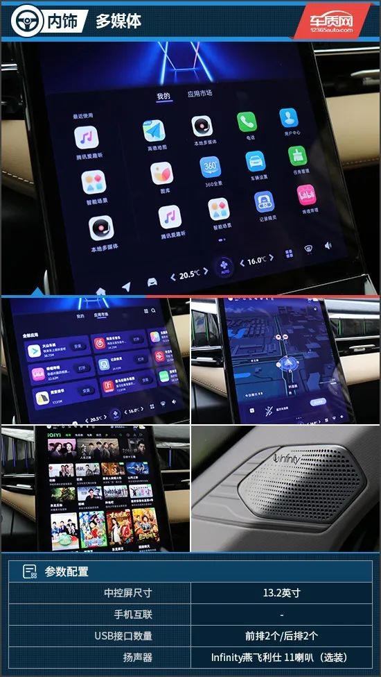 13.2英寸竖置中控屏显示同样细腻,车机配备了吉利银河OS Air系统,搭配高通骁龙8155芯片,操控时的反应速度得以保证。功能上,除了常见的卫星导航、语音控制识别功能外,在有网络的情况下还支持网易云音乐、火山车娱、爱奇艺等多种APP。在音响方面,本次试驾车型选装了Infinity燕飞利仕音响系统,视听效果得以保证。