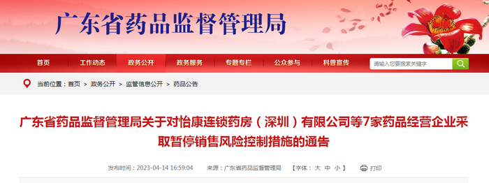 关于对怡康连锁药房(深圳)有限公司等7家药品经营企业采取暂停销售风险控制措施的通告