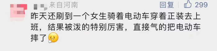 视频显示,有女生骑电动车经过正在泼水的人群,被“轮番攻击”后全身湿透,不得已只能用手掩面。还有视频显示,女子骑车时被泼得全身湿透,因视线模糊、重心不稳,导致车子侧翻。