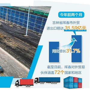 今年前两个月,在国际市场需求走弱的形势下,吉林省珲春市外贸进出口额达31.59亿元,同比增长31.7%,占全省进出口额的比重达13.3%。