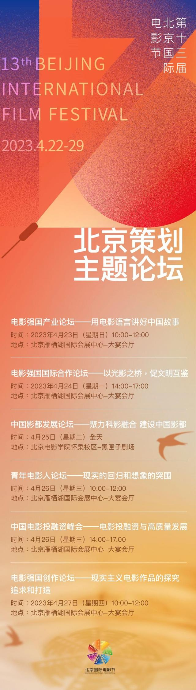 北京策划·主题论坛邀请来自各影视机构、专业院校以及社会各界关注北影节的朋友们参加,请有意向的观众朋友将个人信息(包括姓名、身份证号、联系电话、所在机构/学校名称、职务、报名参加论坛场次、参与活动目的等)发送至邮箱:filmforum@bjiff.com,我们将邀请部分观众来到活动现场,报名截止日期为2023年4月21日。
