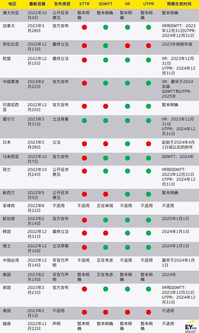 4.原表对各国信息的梳理截止于2023年2月15日,见《简报》第13页。我们在此基础上已根据加拿大、日本、英国、爱尔兰、中国香港及新加坡的官方发布的最新信息对相应内容予以更新。https://www.ey.com/en_ca/tax/tax-alerts/2023/tax-alert-2023-no-19;https://gtnu.ey.com/news/2023-5377-japan-enacts-2023-tax-reform-bill-including-legislation-to-implement-iir-to-align-with-oecd-beps-20-pillar-two?uAlertID=wv7W8MuE%2bSMDtP5IAOX57Q%3d%3d;https://www.gov.uk/government/publications/spring-budget-2023-overview-of-tax-legislation-and-rates-ootlar/spring-budget-2023-overview-of-tax-legislation-and-rates-ootlar;https://www.gov.ie/en/press-release/f344f-minister-mcgrath-launches-next-phase-of-consultation-on-eu-minimum-tax-directive/;