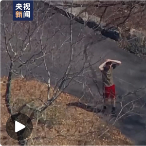 4月13日,马萨诸塞州波士顿以南的乡村小镇代顿。一名身穿红色短裤的男子正在露台上看书。在多个航拍设备的监控下,联邦调查局特工实施了逮捕,这名男子双手抱头,没有抵抗。
