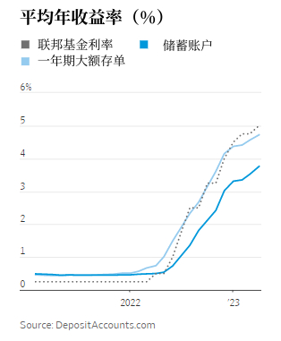 标准储蓄账户的存款利率在过去一年里小幅上升。FDIC的数据显示,3月份美国的银行和信用合作社的平均存款利率为0.37%,而上年同期为0.06%。但存款账户的利率变化得更快,Deposits online LLC的指数显示,3月份在线储蓄账户的平均收益率升至3.75%左右,一年前为0.5%。网上一年期存单的年平均收益率接近4.75%,高于2022年的不到1%。