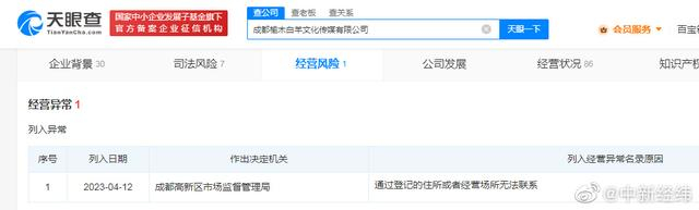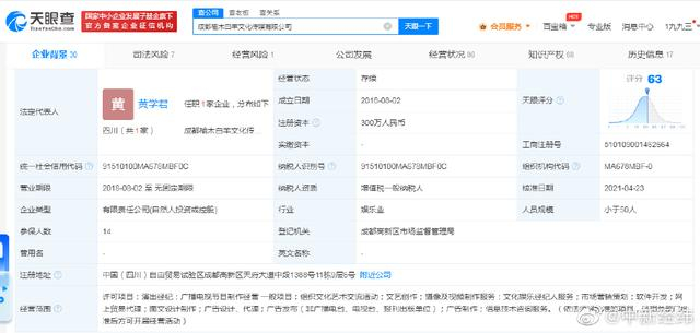 天眼查App显示,近日,成都榆木白羊文化传媒有限公司因通过登记的住所或者经营场所无法联系,被成都高新区市场监督管理局列入经营异常名录。该公司成立于2018年8月,法定代表人为黄学君,注册资本300万人民币,经营范围含演出经纪;广播电视节目制作经营;文艺创作;市场营销策划等。张榆密(密子君)持有该公司99%股份,并担任执行董事。不久前,密子君被曝直播带货的无骨鸡爪里有蟑螂,密子君对此向网友及商家道歉,称蟑螂是自己红油碗中的,并晒出相关质检报告。