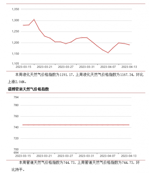 淄博天然气价格指数显示,本周液化天然气整体运行趋势较上周来看先涨后跌,本周最高点出现在周二,为1199.45,最低点出现在周五,为1155.29,液化天然气样本企业周均价为4730元/吨;管道天然气本周与上周环比持平,本周管道天然气价格指数为744.73,管道天然气周均价为4.18元/立方米。