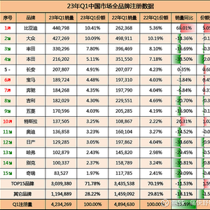 3、23年Q1也是第一次有两个100%新能源品牌入榜全市场销量的TOP10!新能源对传统燃车的替代,已经是不可逆转了。