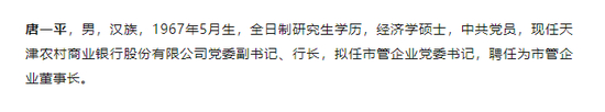 4月12日,天津市委组织部发布干部任前公示显示,现任天津农商行党委副书记、行长唐一平拟任天津市管企业党委书记,聘任为市管企业董事长。