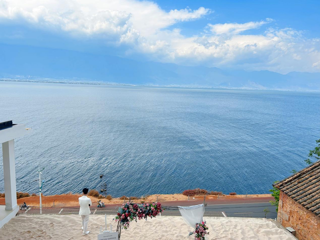 2023年3月底,澎湃新闻记者走访时发现,与传统的影视棚不同,文笔村的旅拍空间大都属于半开放式。纯白的礼堂与碧绿的洱海、蔚蓝的天空,形成一幅绝美的画作,不少穿着婚纱、西装的青年男女正以此为背景拍摄婚纱照。如今,目的地婚礼、婚庆旅拍产业已成为大理旅游新业态发展中的重要一环。