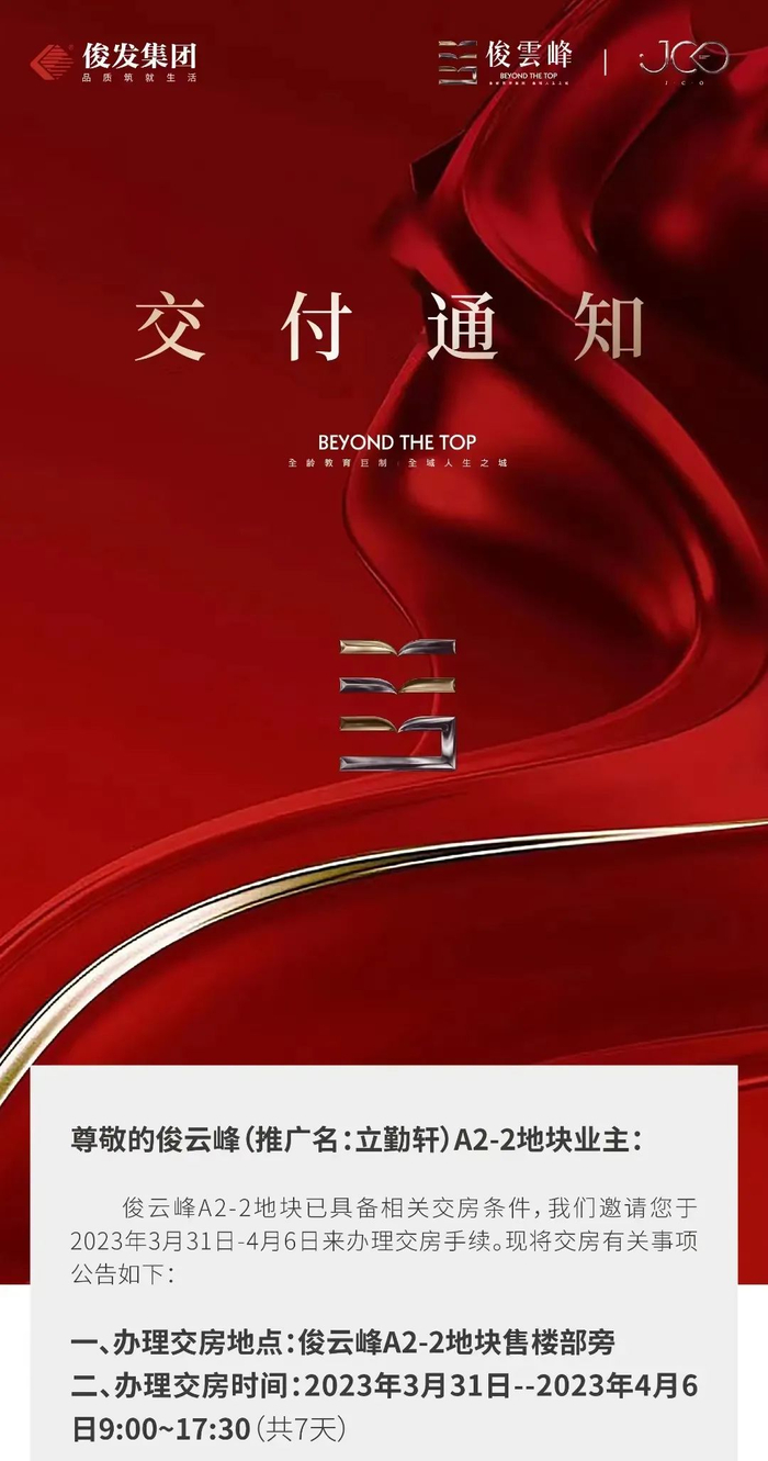 今年可以说是俊发的“交付大年”。3月25日,俊云峰官微发布立勤轩(A2-2地块)交付通知书,涉及7栋住宅,于3月31日—4月6日办理交房手续。另外,俊发城文熙苑已于今年1月启动交付,共交付6栋住宅。