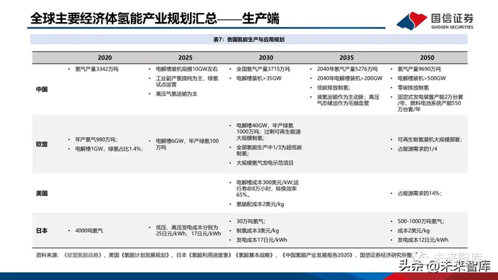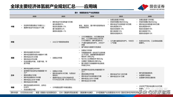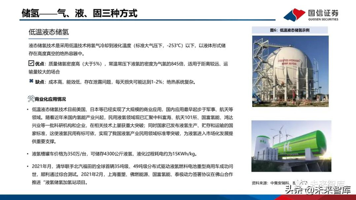 低温液态储氢技术目前美国、日本等已经实现了大规模的商业应用,国内应用最早起步于军事、航天等 领域。随着近年来国内氢能产业兴起,民用液氢领域现已汇聚中科富海、航天101所、国富氢能、鸿达 兴业等一批科研机构和企业,在相关技术上屡获重大突破;同时国家已发布液氢生产、贮存和运输的国 家标准,这使液氢民用有标可依,实现了我国液氢产业民用领域标准零突破,为液氢进入市场化发展提 供重要支撑。液氢槽罐车价格为350万/台,可储存4300公斤液氢,液化过程耗电约为15KWh/kg。2021年月,清华联手北汽福田的全球首辆35吨级、49吨级分布式驱动液氢燃料电池重型商用车成功问 世,顺利通过综合测试。2021年2月,上海重塑、佛燃能源、国富氢能、泰极动力签署协议在佛山合作 推进“液氢储氢加氢站项目。