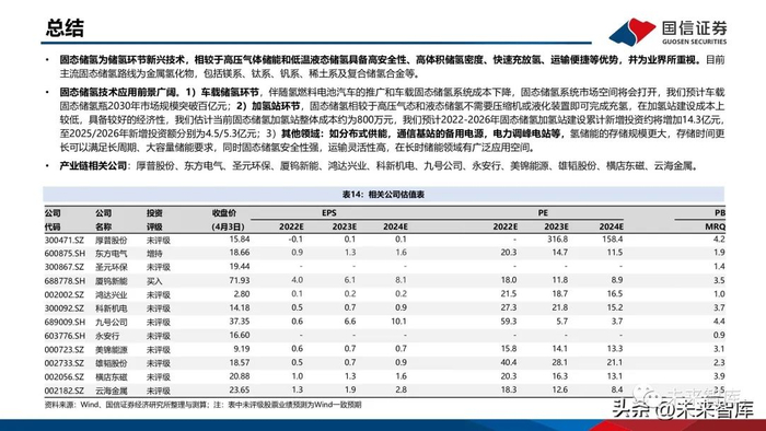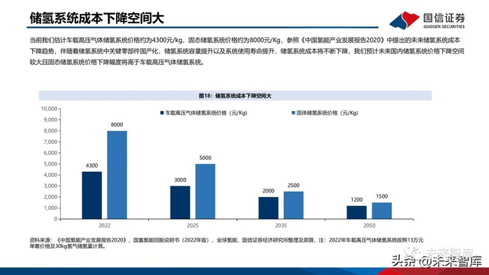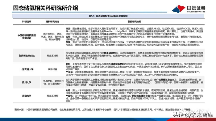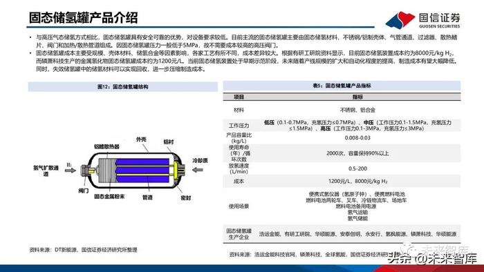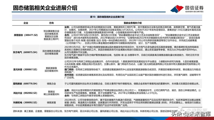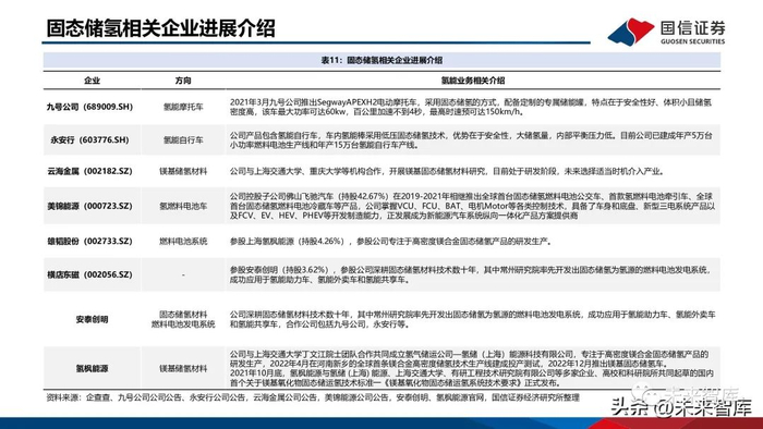 固态储氢从体积储氢密度、安全性等因素考虑,是最具商业化发展前景的储存方式之一。固态储氢目前在交通领域起步相对较早,氢能自行车、两轮车、燃料电池叉车、加氢站均有示范项目;国 内企业如厚普股份也在开发车载固态储氢瓶,目前钛系储氢装置售价在2万元/kg,未来希望通过规模化生 产,降至8000元/kg以内。固态储氢在电力调峰领域也有示范项目,包括华电集团、云南电科院、有研科技集团等在四川泸定、昆明、 张家口建设了相关示范项目。在备用电源领域,应用于数据中心、医院、社区等工商业的示范项目。在工业领域:目前化工上使用的是高压储气罐,安全性存在挑战、复杂度很高。而固态储氢可以作为长期 的储存,减轻安全压力;还可以实现工业副产氢净化-储运一体化。一辆储运车可直接充装和纯化1.2吨氢 气,得到99.999%的高纯氢,有效降低储运成本。