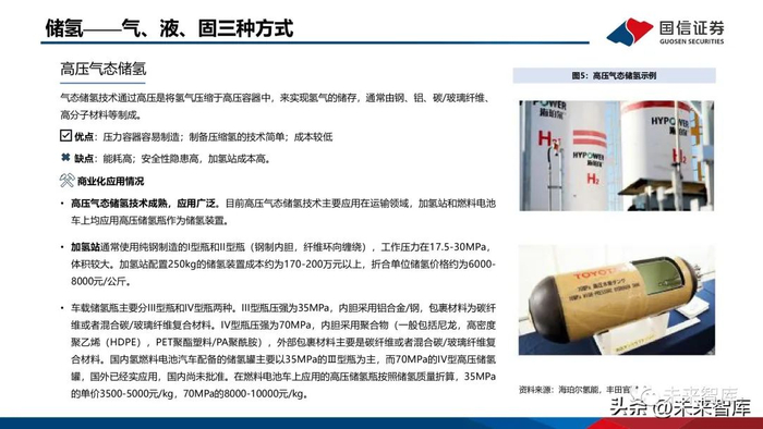 高压气态储氢技术成熟,应用广泛。目前高压气态储氢技术主要应用在运输领域,加氢站和燃料电池 车上均应用高压储氢瓶作为储氢装置。加氢站通常使用纯钢制造的I型瓶和II型瓶(钢制内胆,纤维环向缠绕),工作压力在17.5-30MPa, 体积较大。加氢站配置250kg的储氢装置成本约为170-200万元以上,折合单位储氢价格约为6000- 8000元/公斤。车载储氢瓶主要分III型瓶和IV型瓶两种。III型瓶压强为35MPa,内胆采用铝合金/钢,包裹材料为碳纤 维或者混合碳/玻璃纤维复合材料。IV型瓶压强为70MPa,内胆采用聚合物(一般包括尼龙,高密度 聚乙烯(HDPE),PET聚酯塑料/PA聚酰胺),外部包裹材料主要是碳纤维或者混合碳/玻璃纤维复 合材料。国内氢燃料电池汽车配备的储氢罐主要以35MPa的Ⅲ型瓶为主,而70MPa的IV型高压储氢 罐,国外已经实应用,国内尚未批准。在燃料电池车上应用的高压储氢瓶按照储氢质量折算,35MPa 的单价3500-5000元/kg,70MPa的8000-10000元/kg。